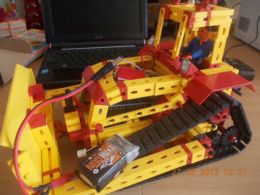 Вот фото соединений проводов (питание и два канала) А вот - общее фото бульдозера Аккумулятор 800 мАч - от RC моделей. Шесть батареек АА проработали час и разрядились.