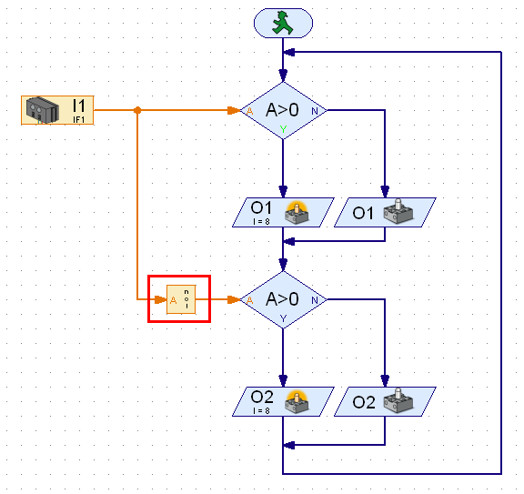Сигнал от датчика траектории 128598 следует инвертировать в программе. Так как это логический сигнал, то для инвертирования можно использовать соответствующую логическую операцию. Ниже я привел пример использования блока, выполняющего операцию логического инвертирования.