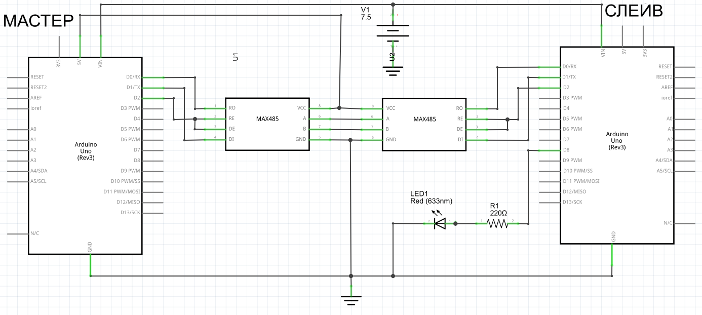 Здравствуйте! Проблема такая: я хочу осуществить передачу между двумя Ардуино Уно с помощью протокола Модбас через RS485. Нашел скетчи, собрал схему, но ничего не работает! Помогите разобраться в чем проблема, может ошибка в подключении, может в коде.....Прилагаю скетчи мастера и слейва, а также схему, которую собрал. Как должно быть: Мастер записывает в нулевой регистр единицу, а слейв эту еденицу подает на вывод с подключенным диодом (мне хотя бы для начала сделать это...).