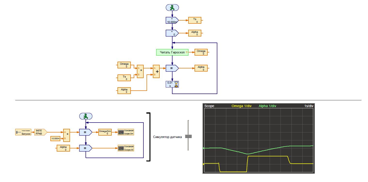 Для тестирования я создал программный "симулятор" гироскопа. Его выходные значения можно задавать в реальном времени вручную с помощью бегунка: Обратите внимание на ригистрограмму сигналов. Угол поворота изменяется только когда угловая скорость omega отлчается от нуля.